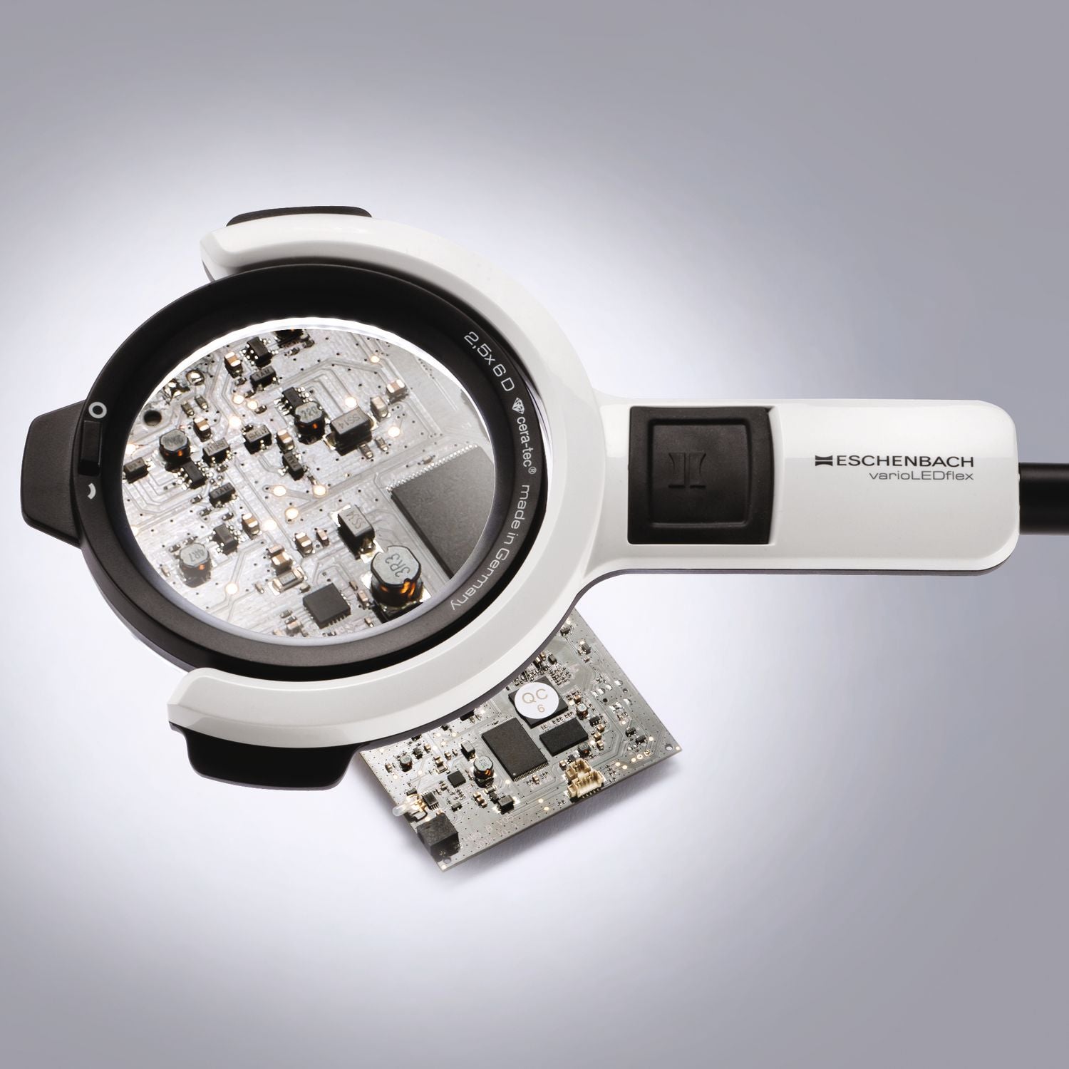 Die ultraflexible Lupenleuchte varioLEDflex von Eschenbach bietet die Möglichkeit zwischen schattenfreier LED-Ringbeleuchtung und Segmentschaltung umzuschalten. Mit der Segmentschaltung können einzelnen Bereiche des LED-Rings ab- oder zugeschaltet werden. Durch den kontrollierten Schattenwurf können auch feine Strukturen auf der Oberfläche sichtbar gemacht und beurteilt werden.