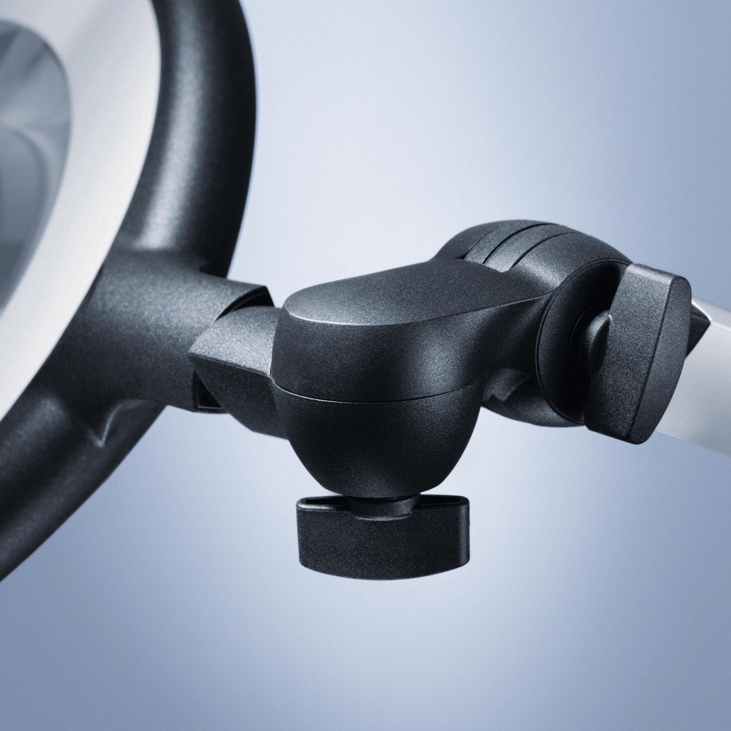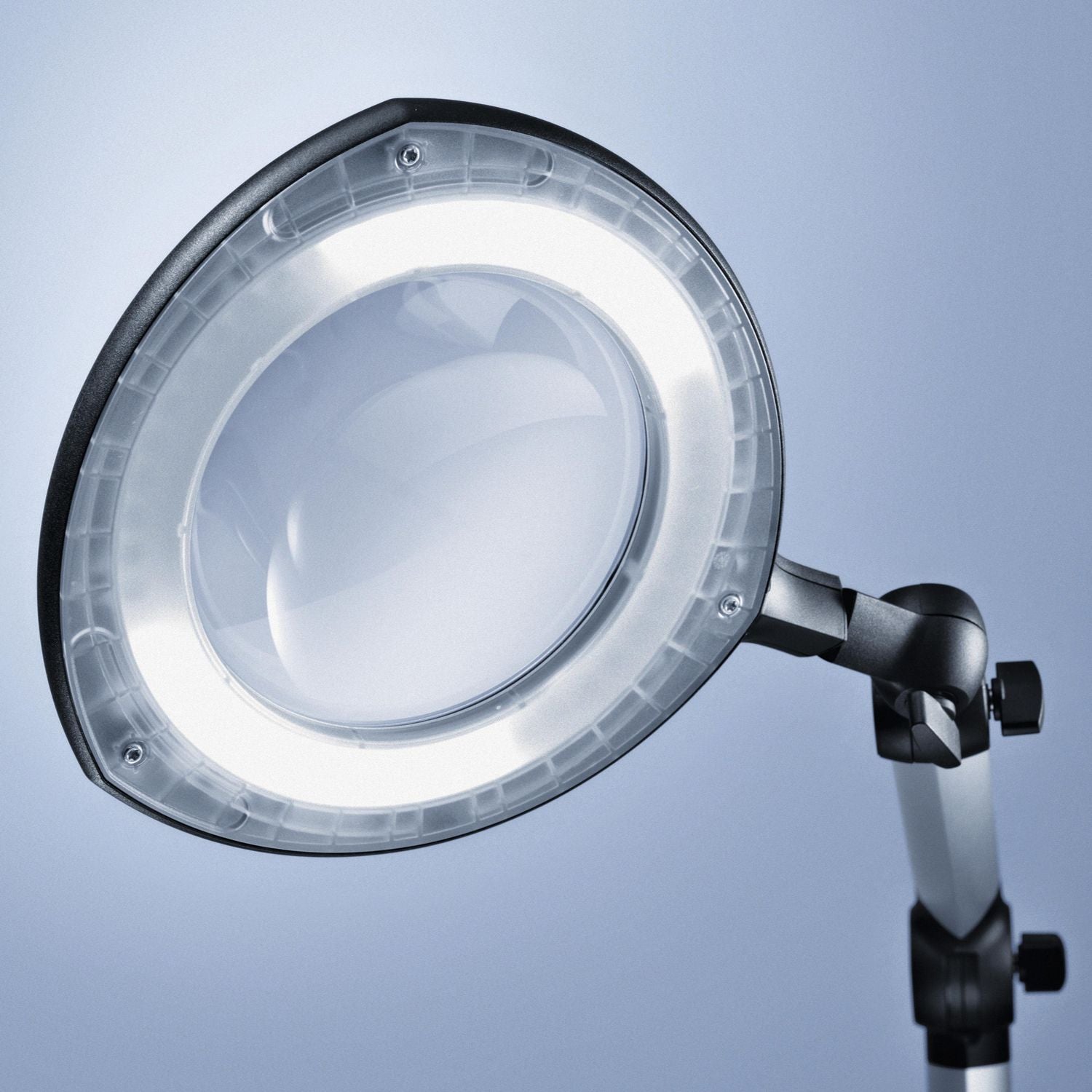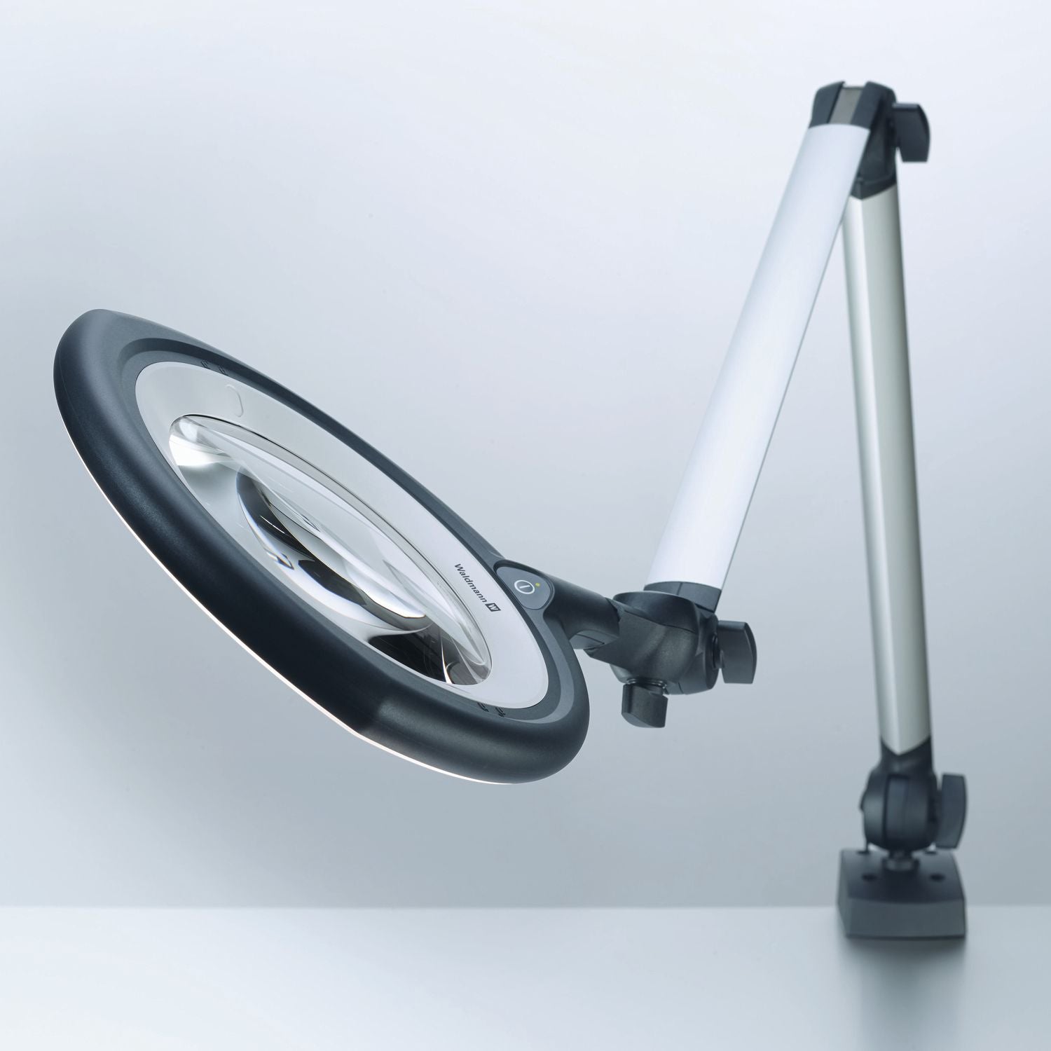 Die Bedienung erfolgt mit einem Multifunktionstaster im Leuchtenkopf für Ein/Aus, stufenloses Dimmen und mehrstufiges Schalten.Das stabile Gestänge, die geschlossenen Gelenke, das robuste farblos eloxierte Aluminium und der verwendete schwarze Hochleistungskunststoff sorgen für perfekte Ergonomie und machen die Lupenleuchte zu einem langlebigen und robusten Partner.