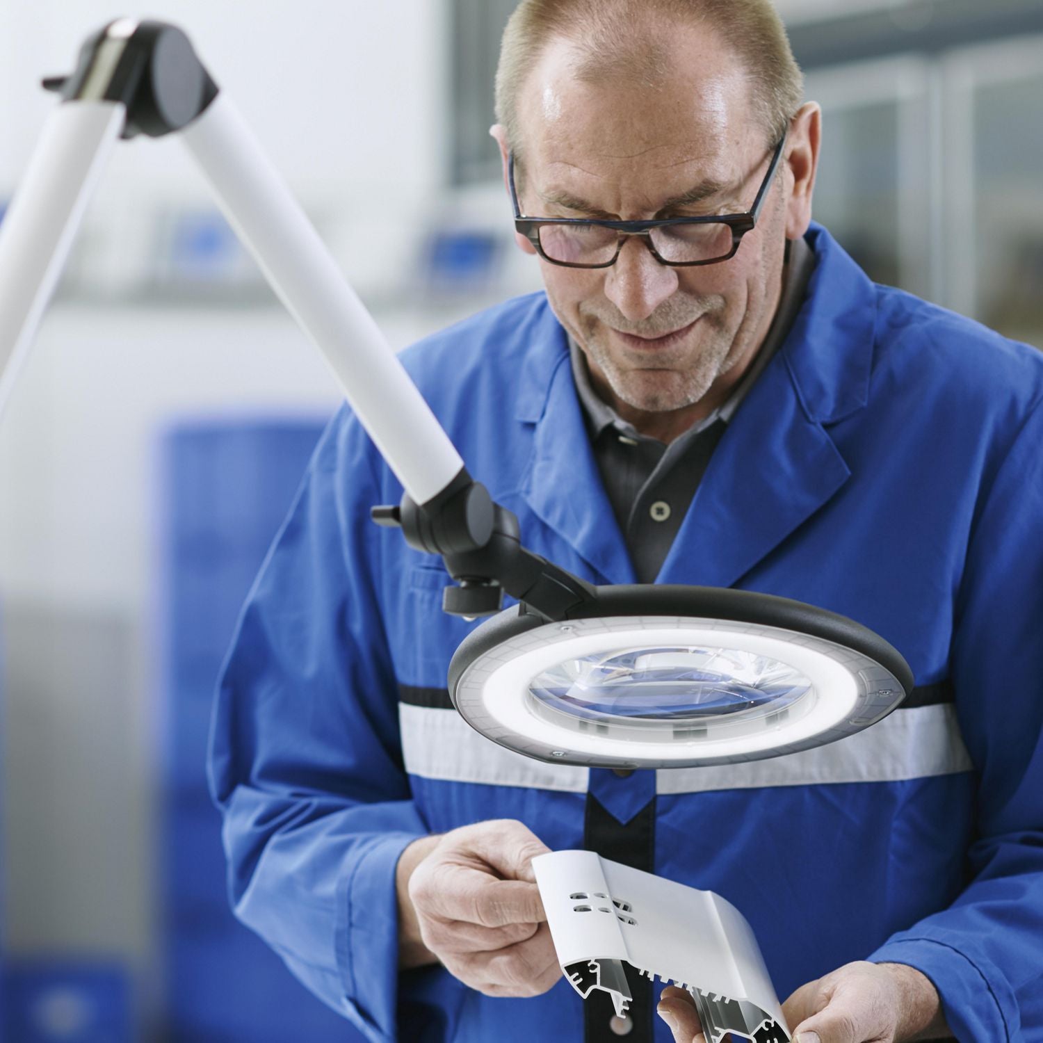 Waldmann setzt mit seiner LED Lupenleuchte TEVISIO höchste Ansprüche an Beweglichkeit und Sehqualität. Auch mit der neuen Generation an besten Lupenleuchten bleibt die innovative Gestängetechnologie und das ausgereifte Lichtkonzept erhalten, ganz neu ist dabei der noch höhere Farbwiedergabewert (Ra > 90; R9 > 70) und die noch homogenere Lichtverteilung. So ist diese Lupenleuchte die opitmale Unterstützung bei der Bewertung und Verifizierung von Farb- und Oberflächenqualitäten. Die eingetrübte Blende sorgt zusätzlich dafür, dass keine Einspiegelung stören.